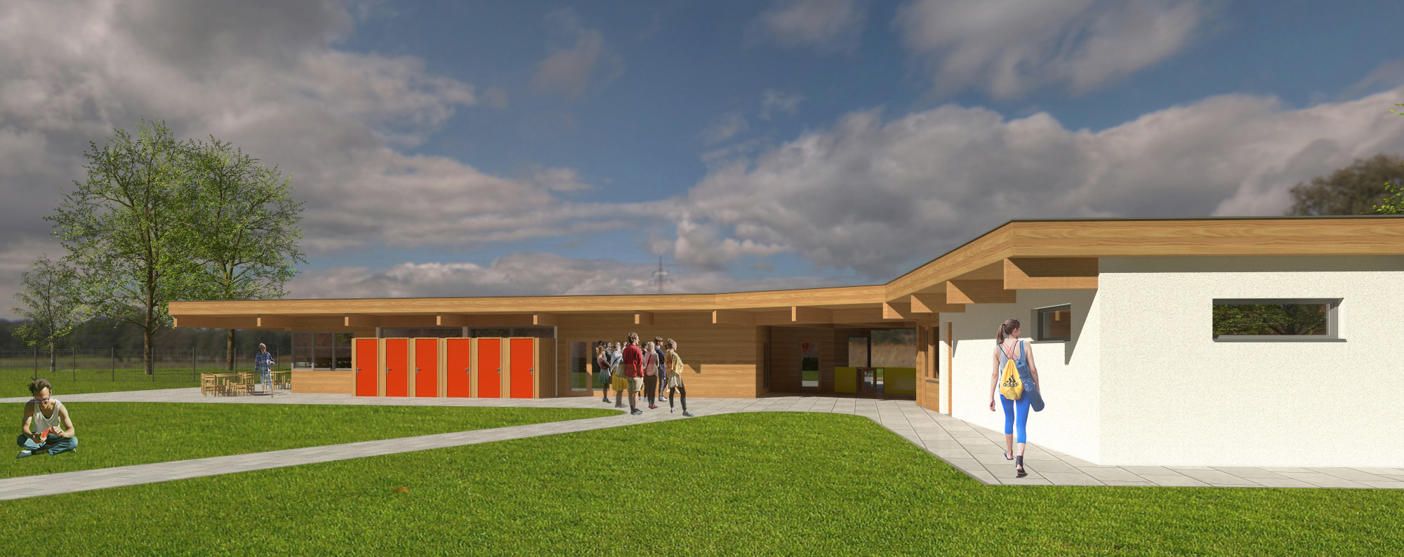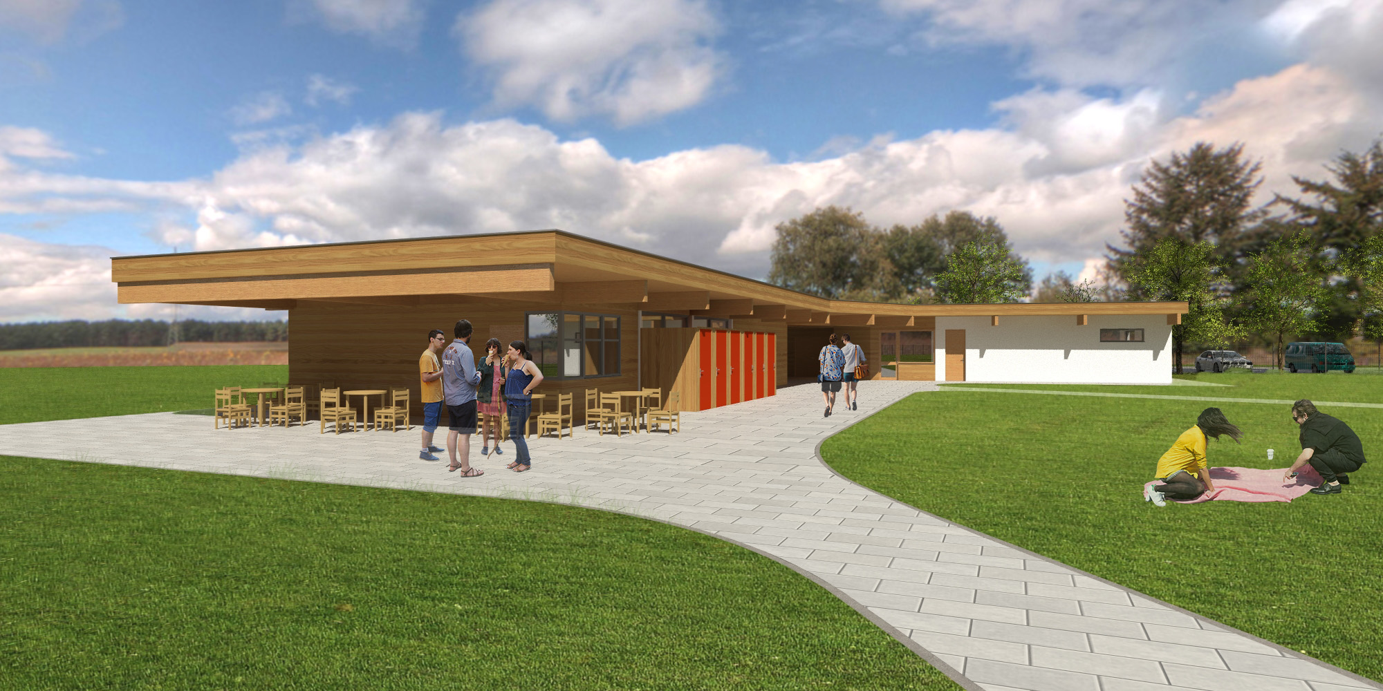 Vizualizace koupaliště – pohled na obslužný objekt od východu