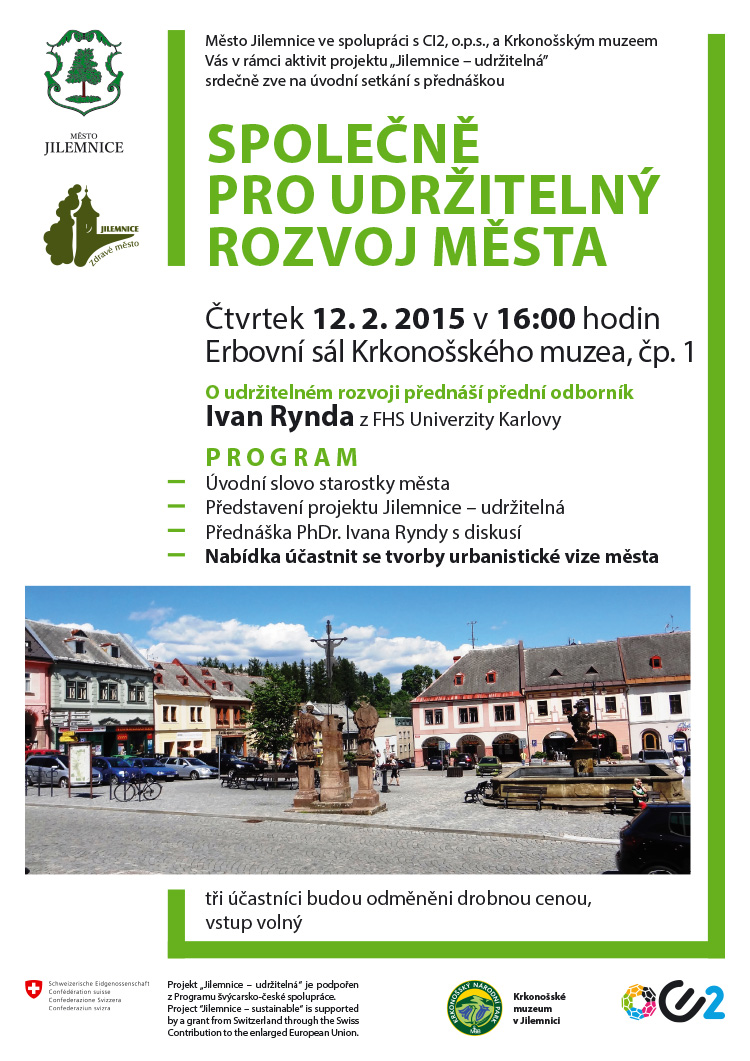 Vstupní přednáška projektu financovaného ze Švýcarských fondů "Jilemnice - udržitelná" s možností se aktivně zapojit do pracovních skupin k rozvoji města. O udržitelném rozvoji bude poutavě přednášet RNDr. Ivan Rynda