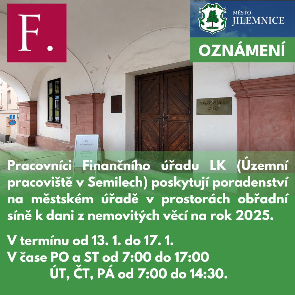 V souvislosti s podáváním daňových přiznání k dani z nemovitých věcí na rok 2025 je na Územním pracovišti v Semilech zajištěn provoz informační linky 481 660 111, 481 660 361, 481 660 363.