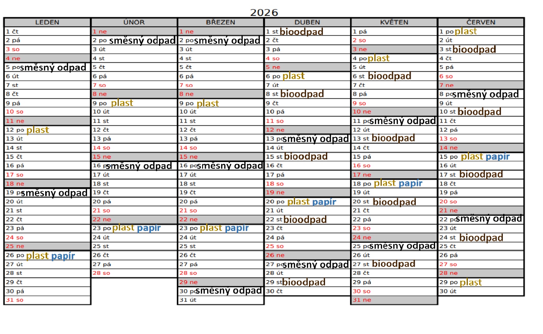 Kalendář svozů pro jednotlivé typy odpadů najdete v přiloženém letáku.