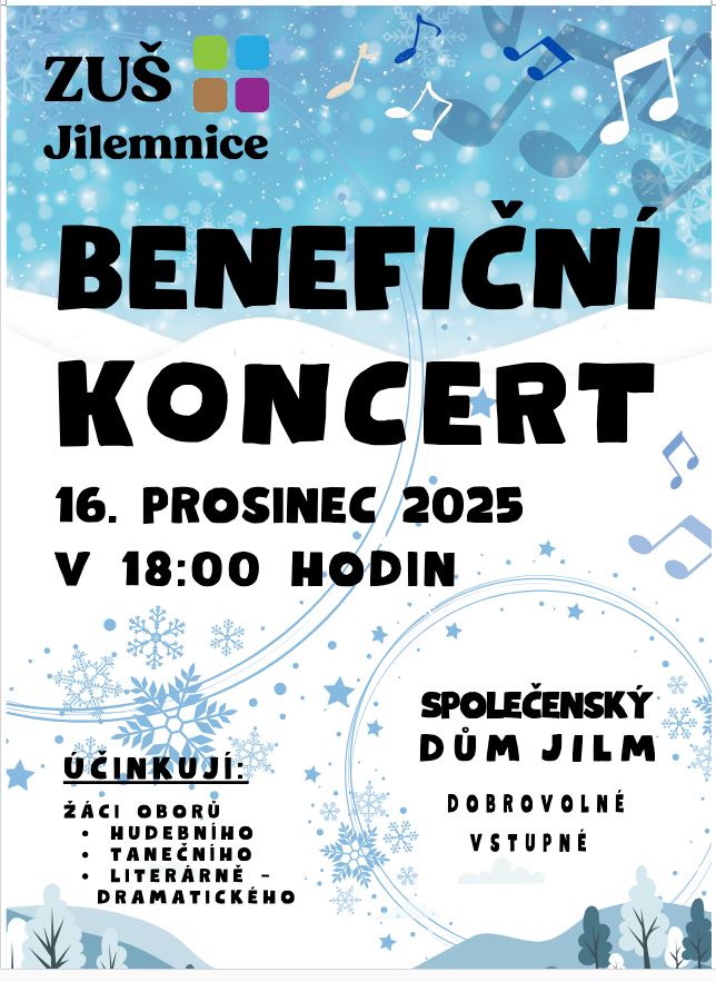 V úterý 16. prosince 2025 se od 18 hodin bude konat ve velkém sále SD Jilm Benefiční koncert žáků ZUŠ. V programu vystoupí žáci hudebního, tanečního a literárně-dramatického oboru, pěvecký sbor a soubory.