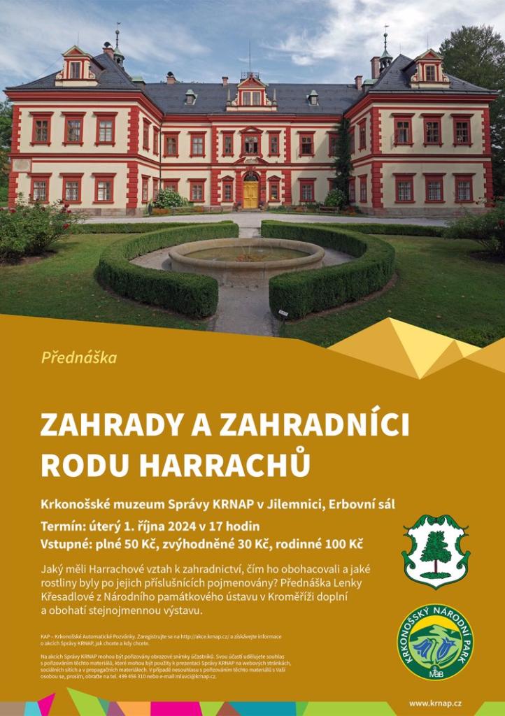 Jaký měli Harrachové vztah k zahradnictví, čím ho obohacovali a jaké rostliny byly po jejich příslušnících pojmenovány? Přednáška Lenky Křesadlové z Národního památkového ústavu v Kroměříži doplní a obohatí stejnojmennou výstavu.